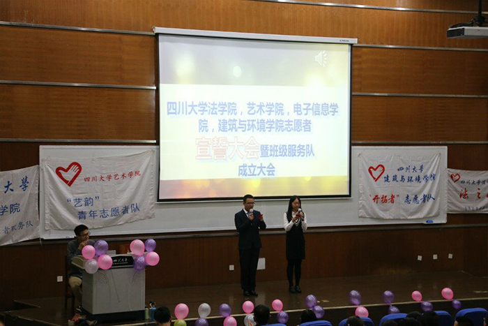 2017年10月21日星期六19点30分,太阳集团tyc9728,艺术学院,建筑与环境学院,法学院四院联合在ok138cn太阳集团江安校区综合楼C座407举办了2017年度青志宣誓大会暨班级服务队成立大会。参与此次宣誓大会的嘉宾有华西药学院,高分子科学与工程等学院的青志队长。
