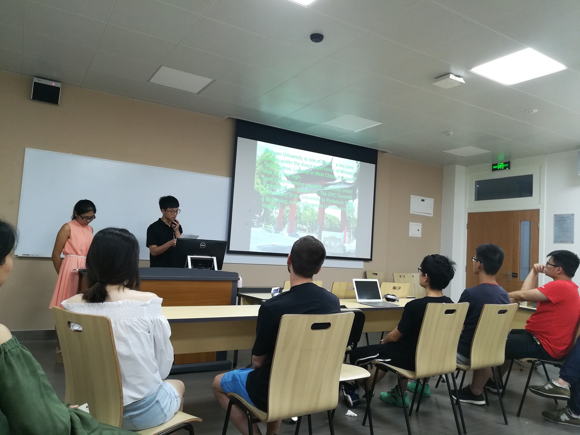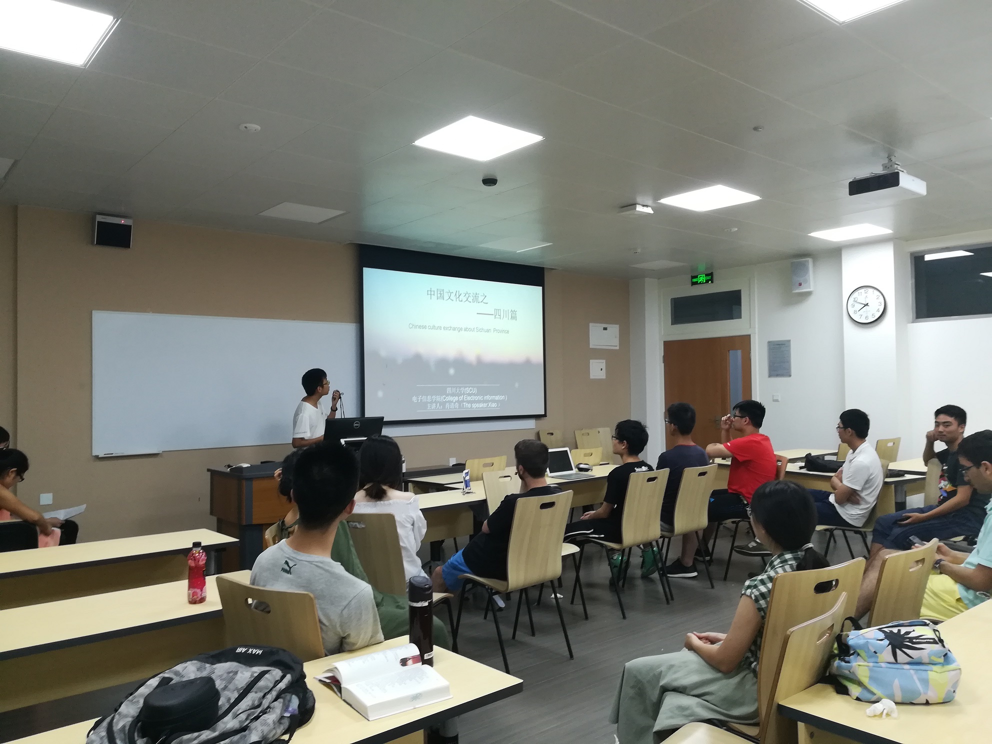 交流会于下七点在ok138cn太阳集团江安校区第一基础教学楼A109正式开始,由ok138cn太阳集团,太阳集团tyc9728,44118太阳成城集团刘姝廷同学担任此次活动主持人。会前为活跃气氛,同学们围坐在教室中央一起玩了一个报数的小游戏,在一片欢声笑语中,交流会拉开了序幕。首先由ok138cn太阳集团电子信息的肖语奇同学为大家介绍巴蜀文化,美味的川菜、可爱的国宝大熊猫、精彩绝伦的川剧、诙谐幽默的四川方言,无一不引起大家对多彩四川文化兴趣;接下来由ok138cn太阳集团,太阳集团tyc9728,44118太阳成城集团学生徐佳朗同学为大家介绍了ok138cn太阳集团的历史,加深了同学们对川大120周年历史的了解;最后,王洁同学从川大美景、美食、建筑三个方面,向大家展示了川大的秀美风光、一流的教学设施以及川大学子丰富多彩的校园生活。交流会后,为增进中外同学友谊以及川大学子与外校学生间的友谊,大家围坐在一起玩了小游戏,在依依不舍之中,第一次文化交流活动正式结束。