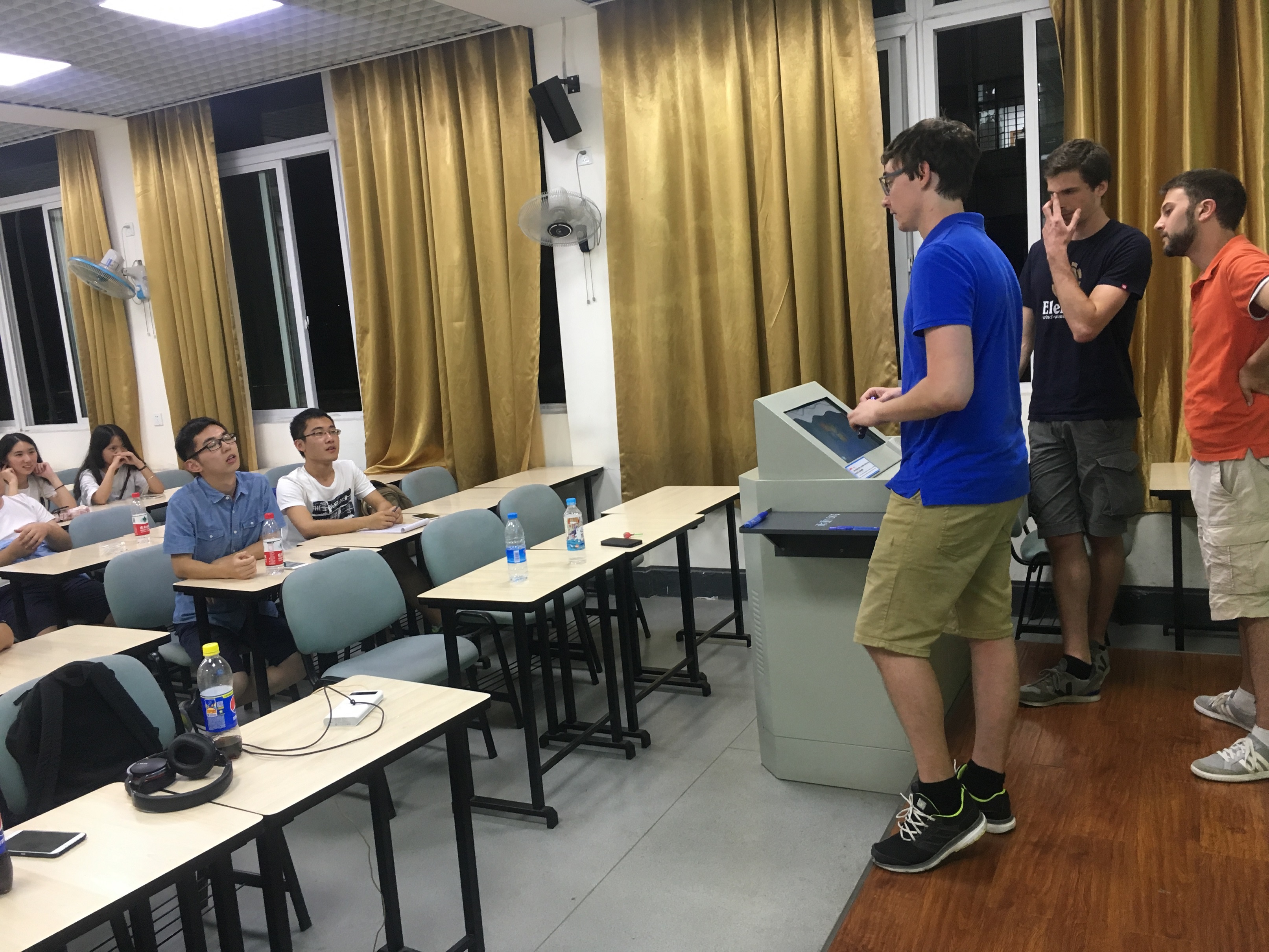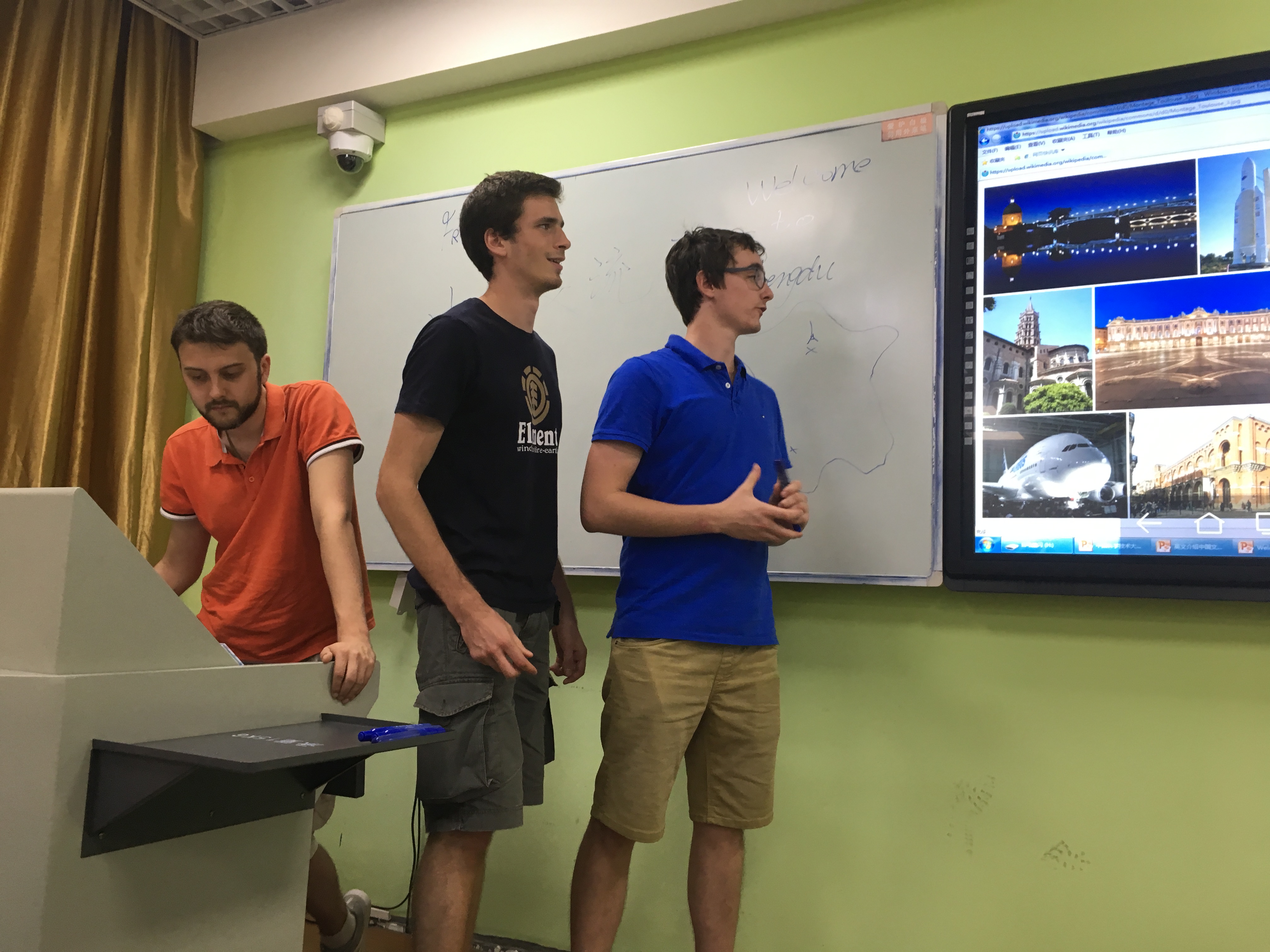 当天晚上8点,三所高校学生到达指定教室。随后由法国学校学生对其国家及学校进行介绍,他们主要采用网络结合PPT的形式讲解。首先,他们从地理位置、饮食、建筑等方面介绍了自己的国家,对每个学生所在地区也进行了一定的介绍,并对应中国同学介绍相关内容讲出其差异性和自己文化的特点,接着他们着重介绍了自己所在的学校,学校历史、学校名字由来、举办的活动、校园概况等内容。最后,对川大学生和中科大学生提出问题做出了回答。