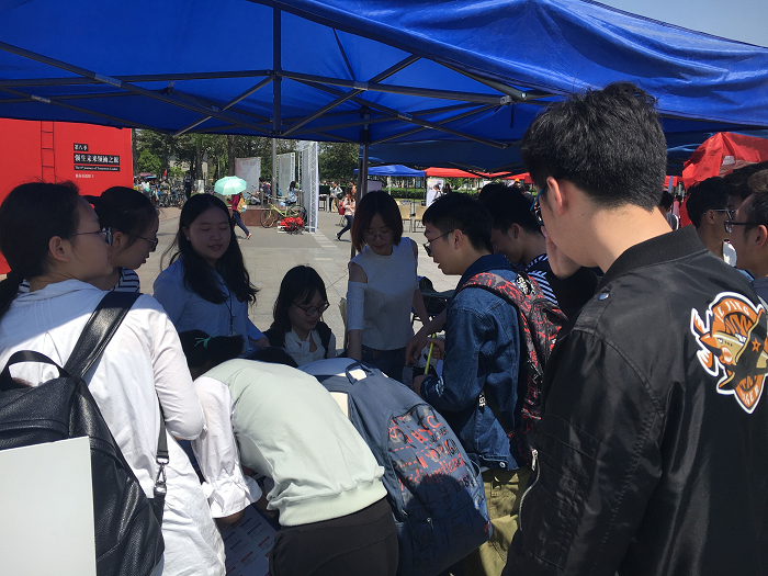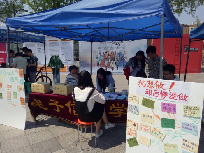 4月14日,组织部干事就早早在场地上准备好各种材料及物资,准备活动的开始。活动分三个板块:“就让往事随风”、“假如时光倒流”和“未曾谋面的朋友”。活动一开始就吸引了大批同学前来参加。有的同学在彩色纸片上写下自己的烦恼,装入信封,投入信箱,象征着忘却自己所忧之事,忘却自己的烦恼。有些同学还选择留下了自己的联系方式,此后会有解忧志愿者联系这位同学,针对同学的烦恼认真提出自己的一些看法,为这位同学解忧。也有很多同学在工作人员预先准备好的一张大的留言板上,写下自己本来想做却因为某种原因而后悔没有做成的事。当留言板写满时工作人员将展板的标题换为“未来我一定要完成的事”,继续供同学们留言。还有同学选择在烦恼信箱中抽取一封忧虑信件,替他人解忧。