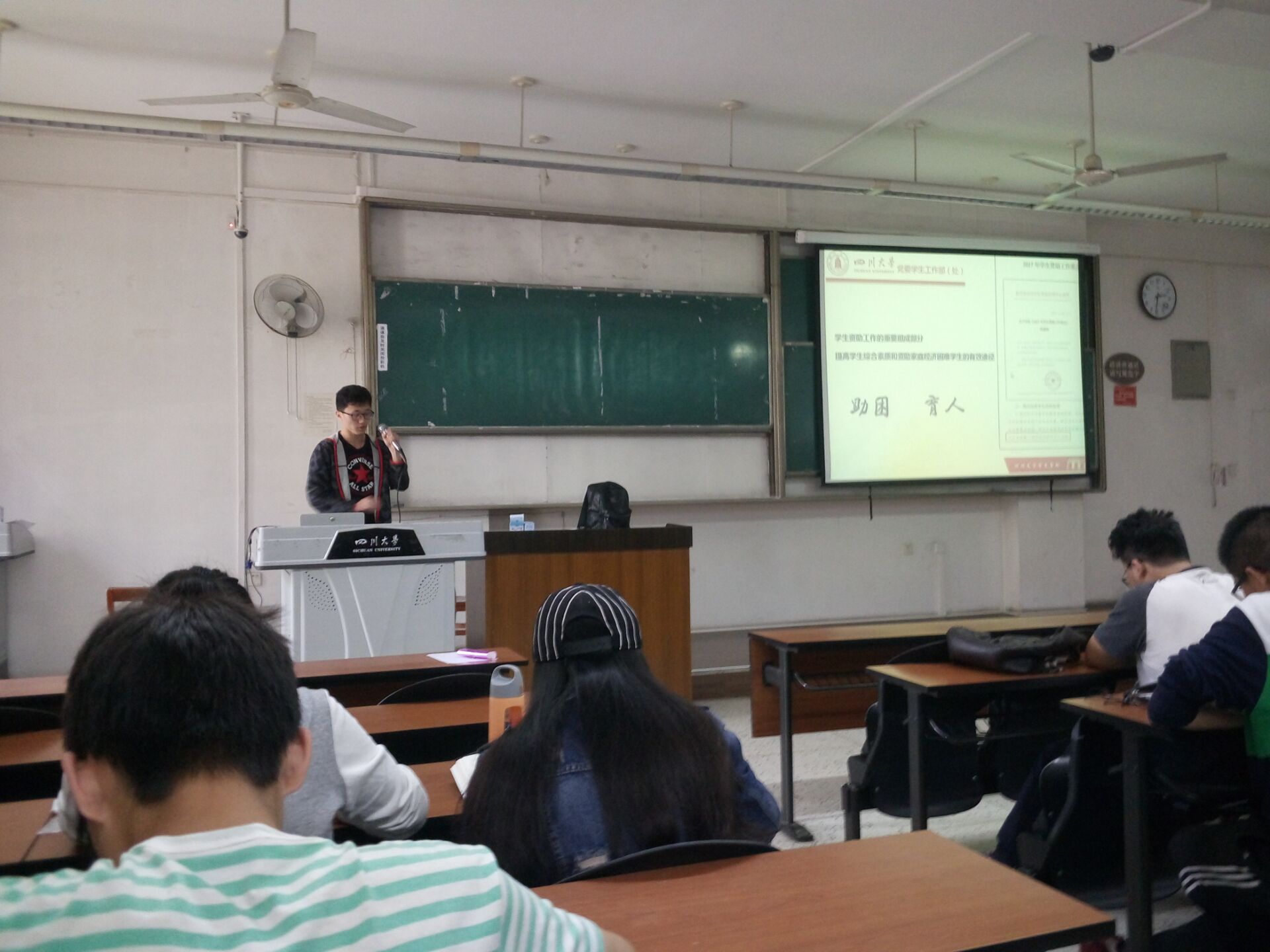 张嘉伦为同学们首先讲解了学工部工作的重要组成部分,之后引申出了勤工助学中存在的诚信问题,包括了大学生中存在的诚信乱象,并且说明了这些诚信小事对自己以后生活的影响。之后他过渡到了第二部分,讲述了奖助学金评定三个阶段中各自存在的一些问题,并进行了解释举例,让同学们真正了解到了其中存在的问题;之后播放了中国人民银行的微视频《信用名片》,并引申到了第三部分征信问题;首先他解释了什么是征信,并且把诚信、信用与征信做了详细的解释与对比,并且对征信本身做了解释,阐述了其包含的信息内容,以及征信的正面与负面信息,之后给同学们讲解了征信系统下产生的个人信用报告以及征信个人的义务,并且让同学们对个人征信的用途做了了解,并播放四川省草拟的建立公务员诚信档案的新闻,让同学们了解到征信问题的重要性,之后着重阐述了个人信用报告的内容以及贷款逾期的后果,并举例子;最后,讲解建立良好信用的重要性,并把资助中心的联系方式告诉了大家以便同学们有疑惑。