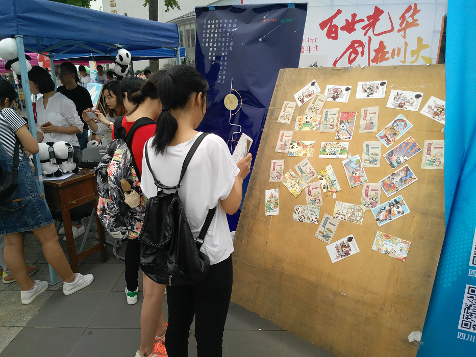 活动于上午12时准时开始。可爱的熊猫邮筒和玩偶,带着浓浓四川味道的定制明信片很快就吸引了一大波的同学。遇到不了解四川发布app的同学,志愿者们耐心为他们作详细介绍并鼓励他们下载。当同学们下载完app的时候,志愿者们带领他们挑选喜欢的明信片并提议他们可以在中秋节来临之际为家人朋友寄上祝福。下午18时,在最后一位同学将明信片投入邮筒之后,活动正式结束。