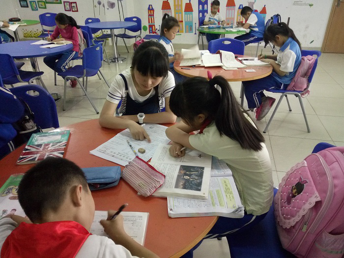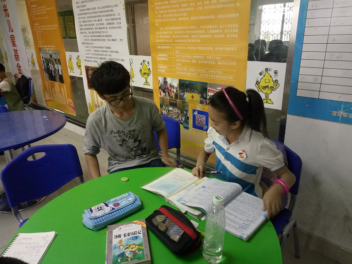 可能是刚刚考过试的原因,同学们一到社区就热情地向志愿者们提问,志愿者们也耐心地一一解答。当同学们开始安静做作业后,志愿者们就在一旁为他们检查,遇到同学们做错的题目,志愿者们会详细地告诉他们错在哪里并引导同学们做出正确解答。偶尔遇到志愿者们表达不清的题目,志愿者便会互相交流并查阅资料以求告诉同学们最确切的答案。遇到听写词语有困难的同学,志愿者们会微笑鼓励并希望他们能将不会的词语多写几遍。