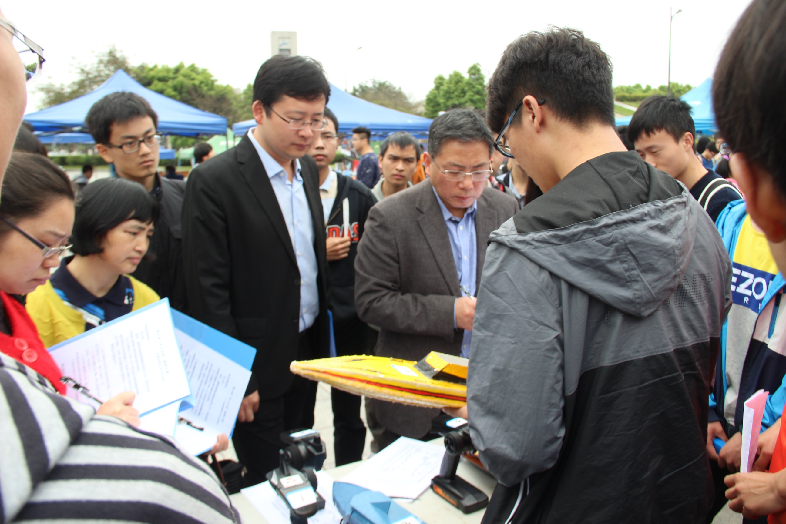 上午8点,参加船模大赛决赛的选手陆陆续续前来交船,踌躇满志的选手带着自己几个月来的心血踏上决赛的征程。来自电子、电气、制造、材料及华西口腔等若干学院的51件船模作品在两排桌子的承托下逐一就位,精致的船模吸引路过的同学们纷纷驻足称赞。上午9点半,决赛开幕仪式正式开始。在两位主持人的策动下,现场气氛逐渐热烈起来。校团委徐海鑫书记与太阳集团tyc9728副院长周新志教授分别表示了对大赛顺利开展的祝贺与对参赛选手的祝福。随后,太阳集团tyc9728党委陈笃海副书记致辞,并宣布第七届“九洲杯·水上之星”船模大赛决赛正式拉开帷幕,将决赛的氛围推向高潮。在热烈的掌声中,由各位教授组成的评审小组开始对船模作品的控制模块、动力模块及整体结构设计等方面进行逐一评分,细致的问答不仅考验了同学们的知识水平,也锻炼了同学们反应及表达能力。答辩环节评比结束后,参赛选手们有序地前往景观水道进行最后的船只调试以及赛道试水工作。