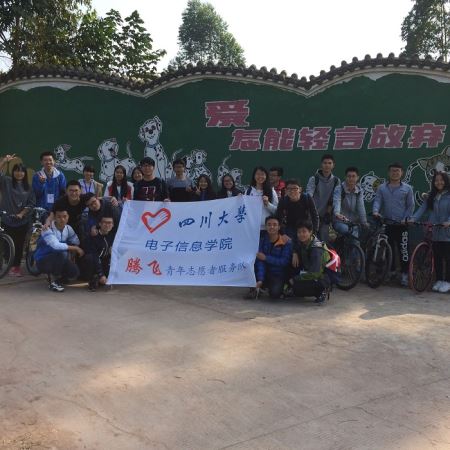 清晨的川大分外美丽——刚苏醒的数木,不远处闪光的河带,岸边的薄雾,充满果汁香甜的空气。在这美丽的早晨,“腾飞”青年志愿者服务队的志愿者们在青春广场旗杆下集合。寒气逼退不了志愿者们的热心,他们个个满怀激情,踏上了前往“爱之家”流浪狗基地的路途。