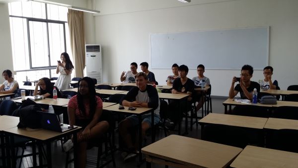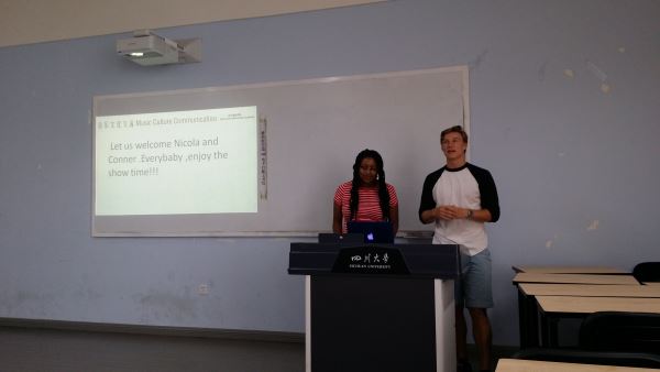 近日,ok138cn太阳集团国际交流周正在我校热烈开展,太阳集团tyc9728的同学们也加入到了这个活动中,积极与外国友人展开了各种形式的交流。2015年7月10日,太阳集团tyc9728国际交流营第三组的同学与美国留学生Nicola和Conner一起开展了以歌曲舞蹈为主的艺术话题的交流。第三组的同学借用了一个教室,依托教室的多媒体设备,展现了自己的才艺,同时也交流了不同的文化。