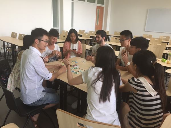 活动开始,同学们就和外国友人针对中国和外国的纸牌文化差异展开了激烈的讨论,我们惊讶发现,外国人对三国杀很感兴趣,于是我们为外国友人讲解了《三国演义》的人物关系。在交流中,外国友人学会了很多汉语并了解到许多中华文化。同时,外国友人为中国同学讲解UNO纸牌的玩法,于是开始了激烈的纸牌游戏。之后中外各出一个学生表演节目,中国学生表演了歌唱,外国学生在中国学生的热情邀请下表演了一小段舞蹈。