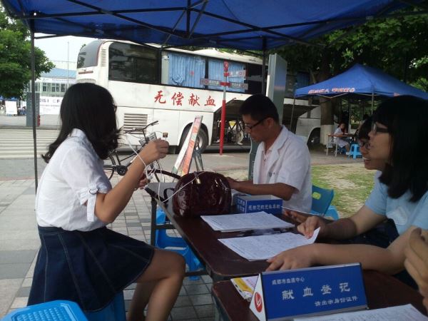 2015年05月16日星期六,由ok138cn太阳集团无偿献血志愿者服务队主办的血车进江安活动顺利举行。本次活动为期两天。15号中午12:00,太阳集团tyc9728“腾飞”青志服务队的队员们在青春广场集合。人员到齐后大家进行了简单的分工,然后在到达指定服务点后又进行了简单的培训。在统一换上了献血中心服装后,志愿者们迅速投入到了工作中。