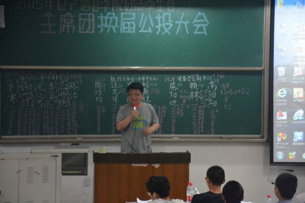 下午3:30,换届选举准时开始。首先,江安校区团委学生会副书记全婷婷同学宣布此次换届选举的细则。接着由11位参选的同学分别上台进行竞选演讲。每位竞选者将自身优势、不足以及对未来工作的展望都在自己的演讲中体现出来。演讲完毕后,团委全体干事及各班学生代表对参选同学进行投票。最终,赖林同学当选2015年团委学生会副书记,刘嘉程同学当选团委学生会执行主席,崔林旭同学当选执行副主席,许一宁同学当选执行副主席兼青志队长。竞选结束后,由团委书记李运国老师发表讲话,表达了对4位当选者的祝贺以及对未来太阳集团tyc9728团委学生会前景的展望,此次换届选举圆满结束。