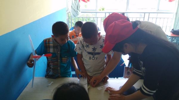 下午14时10分,四名志愿者准时在校园青春广场集合,步行前往目的地,于14时50分志愿者抵达双流县胡夹滩青少年空间。同学们早已在教室里准备就绪,他们在得知要做飞机模型后都十分激动,并愉快地同志愿者们交流起了飞机模型的制作原理。一开始,一名志愿者拿出所有的模型零件,讲述着每个零件的具体作用及用法。由于同学们热情很高,在短暂的讲解后,志愿者们便将同学们分为2人一组并给予制作材料。志愿者们很快融入到同学们中,引导他们学会阅读说明书,思索他们在制作模型中遇到的问题,指导他们完成了模型的拼装。