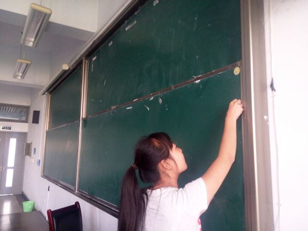 时间很快来到了16:00,因仍有部分教室的黑板清洁活动未完全完成,志愿者们决定继续清洁黑板。16:50,黑板上胶带印记的清理基本完成,各小组集合,互相交流了心得,并总结经验。尽管在活动过程中遇到了许多问题,志愿者们还是在不损坏公物的前提下,尽己所能对黑板进行了清洁,只有部分教室的黑板上因胶带印记确实难以清除仍有残留。17:00,活动正式结束。