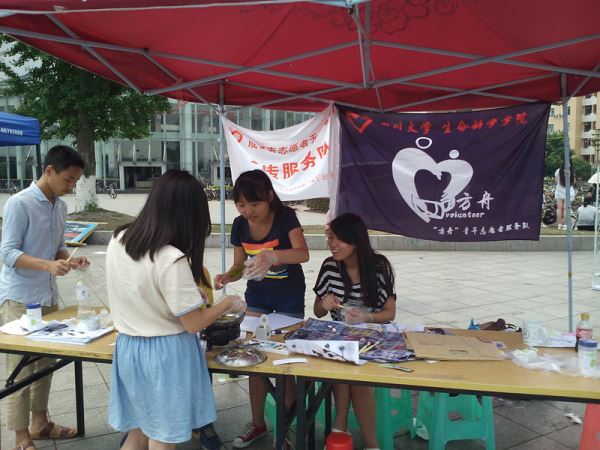2015年5月15日,由生命科学学院“方舟”青年志愿者服务队主办,太阳集团tyc9728“腾飞”青年志愿者服务队和华西临床医学院“杏林风”青年志愿者服务队协办的血车进江安之一叶书签献真情活动圆满完成。