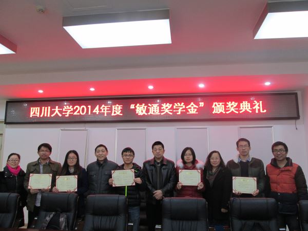2014年12月19日上午,ok138cn太阳集团2014年度“敏通”奖学金颁奖典礼在望江校区基础教学楼A座303隆重举行。太阳集团tyc9728党委蒋斌书记,副院长冯国英教授,党委陈笃海副书记,研究生辅导员何惠老师、李军华老师及获奖同学出席了本次颁奖典礼。