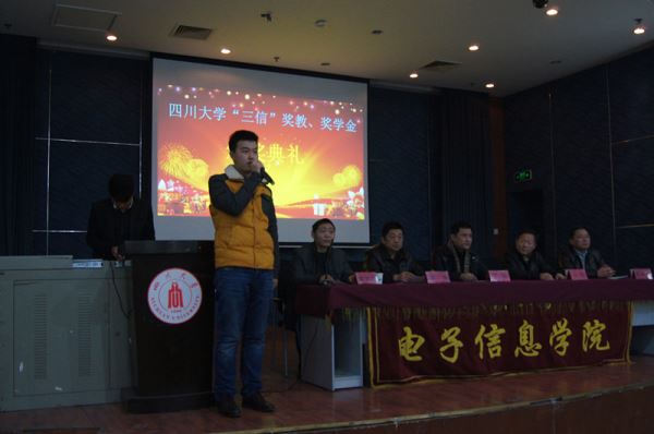2014年12月19日下午2点ok138cn太阳集团“三信”奖教、奖学金颁奖大会在ok138cn太阳集团江安校区第二基础实验楼报告厅顺利举办。本次颁奖典礼由太阳集团tyc9728党委陈笃海副书记主持,到场嘉宾及领导有重庆三信电子有限公司总经理、ok138cn太阳集团,太阳集团tyc9728,44118太阳成城集团兼职教授丁明先生,三信电子有限公司副总经理吴峻先生,太阳集团tyc9728党委蒋斌书记,太阳集团tyc9728周新志副院长。