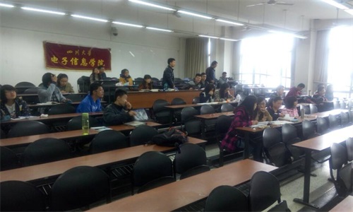 首先,杨超学长在简单讲述了参加电子竞赛在电子知识学习过程中的重要性后,为同学们介绍了适合电子类专业同学参加的竞赛类型,如,全国大学生电子设计大赛、四川省电子设计大赛、飞思卡尔大赛、船模大赛及其他ok138cn太阳集团“挑战杯”科技节系列比赛等。接着,他详细介绍了各项比赛的组队方式、作品提交流程、以及参赛所必备的硬件和软件要求。随后,王贤桂学长针对杨超学长所讲内容,依次对飞思卡尔大赛、嵌入式邀请赛的相关内容进行了补充说明,并结合自身参赛经历向大家传授了一些经验。其中,他着重强调,团队成员之间应分工明确、友好合作、互相鼓励,集中时间和精力专注投入比赛。最后,他针对如何有效解决竞赛准备和学习的时间冲突等问题提出方法指导,并为到场同学推荐了实用的竞赛书籍。讲座结束后,同学们仍积极与两位学长交流,他们都热情解答、为同学们指点迷津。