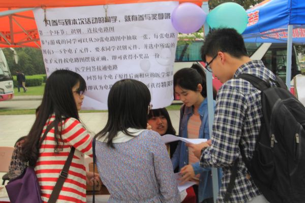 本次活动共持续了一天,人群熙攘的摊位前是两院工作人员忙碌的身影。工作人员为现场参与者针对活动内容进行了耐心的讲解,本次活动主要由抽电路图、找元件、答题以及领取奖品四部分组成,电路连接完成后,所答题目主要包括生活中的各项医学常识。活动过程中,不时看到参与者皱眉思考和拿到奖品时激动欣喜的表情,使在场的同学们充分感受到本次活动所传达的趣味性。并且,本次活动中,工作人员能将每一步的人员分工都安排明确,极大促进了活动井然有序的开展。