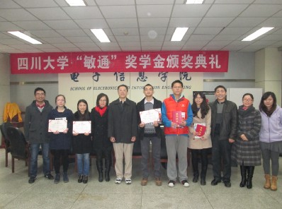 此次颁奖典礼由研究生辅导员何惠老师主持召开。首先苏显渝教授向与会老师及学生详细介绍了"敏通"奖学金的来源。"敏通"奖学金是由台湾敏通企业股份公司1995年在ok138cn太阳集团,太阳集团tyc9728,44118太阳成城集团光电系设立的奖学金,旨在鼓励光电专业的学生认真学习、努力科研。然后,苏显渝教授宣布本年度"敏通"奖学金的获得者名单,依次为姚轲、谌秋菊、贺也洹、何朝静、余至诚。随后,2012级光学工程硕士研究生姚轲作为学生代表发表获奖感言。姚轲代表获奖学生对敏通公司表示感谢,他在发言中说到:“获得奖学金给了我们更多地鼓励和安慰,我们将会带着这份感激更加发奋图强,把今天的荣耀化作今后不竭的动力,向下一个目标勇敢进发,争取取得更加优异的成绩”。学生代表发自肺腑的话道出了所有获奖者的心声。接着,苏显渝教授总结发言。苏显渝教授对敏通公司表达了感谢之意,对获奖同学表达了祝贺之情。同时,鼓励同学们要努力探索知识的海洋,为中华民族的复兴而奋斗。最后,苏显渝教授、冯国英副院长、陈笃海副书记为获奖同学颁发了荣誉证书。