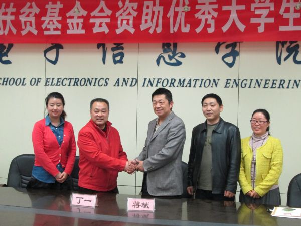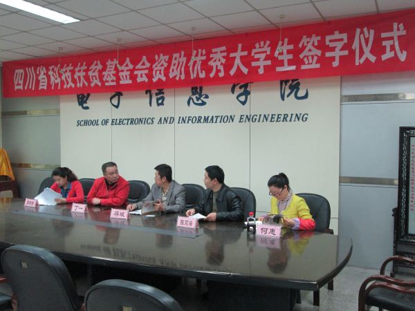 2013年3月19日下午,“四川省科技扶贫基金会资助优秀大学生签字仪式”在我校太阳集团tyc9728基教楼A110会议室举行。太阳集团tyc9728党委书记蒋斌教授、副书记陈笃海老师、学生科科长何惠老师以及四川省科技扶贫基金会理事丁一先生、郭甜甜女士等参加了签字仪式。签字仪式由何惠老师主持。