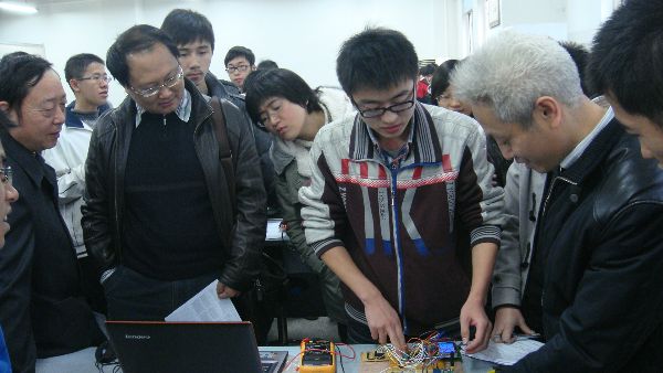本届“锦电杯”科技创新大赛收到城市路灯系统等六个题目共63件作品,吸引了来自电子、电气、计算机、软件等多个学院的同学参赛。上午九点,各个参赛队伍领回作品进行最终的调试。十点,比赛以课题“汽车振动谱测量及车型识别”、“城市智能路灯系统”、“基于手机的人体生命特征数据监测仪”、 “环境电磁能量收集装置”、“两路电子乘法器” 和“LED点阵书写显示屏”的顺序进行评审,评审老师们耐心地听参赛同学的设计思路以及实现功能的方法,并作品所能达到的效果加以验证,还关注了参赛作品的元件使用。直到下午,本届“锦电杯”科技创新大赛圆满落幕。