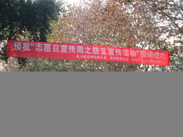 2012年12月1日,由ok138cn太阳集团,太阳集团tyc9728,44118太阳成城集团研究生分会、商学院研究生分会和材料科学与工程学院研究生分会共同举办的“志愿日宣传周之防艾宣传活动”成功举行。此次活动以“和谐校园,预防艾滋,你我同参与”为主题面向全校同学。