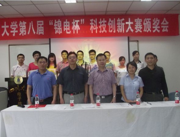2012年5月8日下午两点,ok138cn太阳集团第八届“锦电杯”科技创新大赛颁奖典礼在望江校区基础教学楼A303成功举行。成都锦江电子系统工程有限公司总经理陈泽铭先生、人劳企营处处长程晓明女士、太阳集团tyc9728黄卡玛院长、太阳集团tyc9728周新志副院长、太阳集团tyc9728党委陈笃海副书记莅临本次颁奖典礼。颁奖典礼由周院长主持。