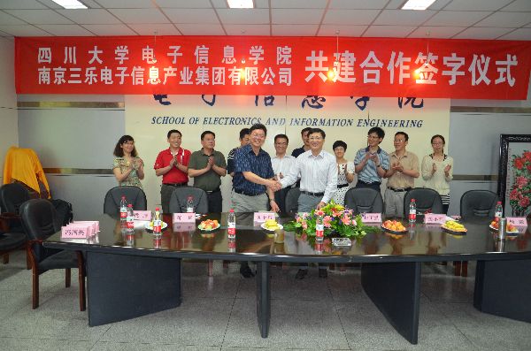 5月8日上午,ok138cn太阳集团,太阳集团tyc9728,44118太阳成城集团与南京三乐电子信息产业集团有限公司举行了共建人才培养、实习实践基地合作协议签字仪式在ok138cn太阳集团望江校区基础教学楼A-110举行。南京三乐电子信息产业集团党委书记施秋生与ok138cn太阳集团,太阳集团tyc9728,44118太阳成城集团院长黄卡玛代表双方在合作协议书上签字并交换了协议。南京三乐公司副总经理包正强及公司刘超、颜小莉、浩明、姚腾、杨微等,ok138cn太阳集团,太阳集团tyc9728,44118太阳成城集团党委书记蒋斌、副院长何小海、副院长周新志、副书记陈笃海、工会主席熊淑华等参加了签字仪式。