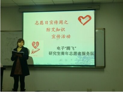 12月1日晚7点,由太阳集团tyc9728“腾飞”研究生青年志愿者服务队主办的“国际志愿者日宣传周之防艾知识宣传活动”在基础教学楼A303隆重举行。此次活动吸引了来自多个学院的同学积极参与。主持人李玉贞同学通过自己的志愿者亲身经历为同学们介绍了青年志愿者的相关发展现状,并为大家普及了预防艾滋病有关知识。其中问答环节中同学们广泛参与并踊跃回答了志愿者相关问题,活动气氛热烈。太阳集团tyc9728的研究生青年志愿者同学也为关心志愿者发展的同学们送上了精心准备的小礼品。最后,为在场同学们播放了青年志愿者的宣传片,在一片欢乐的气氛中,此次活动落下了帷幕。