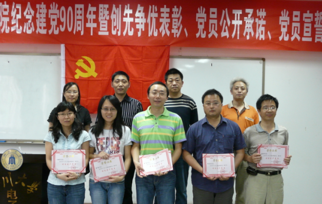 2011-6-21日太阳集团tyc9728在基教A303隆重举行纪念建党九十周年暨创先争优表彰、党员承诺、新党员宣誓大会,学院党委蒋斌书记,陈笃海副书记,学院行政何小海副院长、冯国英副院长参加了大会,参加会议的还有受表彰的先进集体代表、优秀共产党员;教工党支部书记、离退休党支部书记,学生党支部书记及新党员等100余人,大会由学院主管党建工作的徐灿国老师主持。