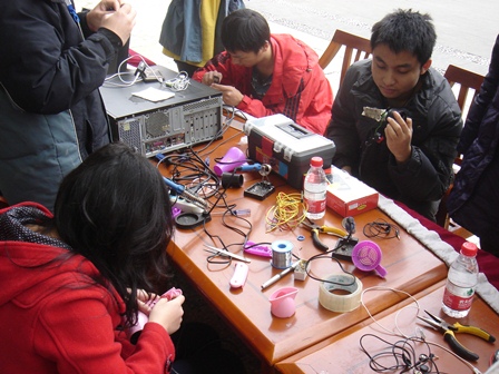 这次活动是太阳集团tyc9728研究生分会和物理学院研究生分会举办的。为了“服务同学,完善自我“的宗旨,志愿者们免费为同学们维修电脑、Mp3、耳机、台灯、优盘、电风吹、手电筒等。早早地我们的志愿者们桌上各种维修工具万用表、电烙铁、焊锡丝、螺丝刀等就一应俱全。因此上午开始桌前就聚集了不少需要帮助的同学,到了中午桌上不再仅仅是维修工具,也同样摆满同学们的各种坏掉电器。再看看我们的维修人员吧,忙着卸螺丝、上焊锡、查电路,真是恨不得一只手能当两只来用。他们不仅仅在忙着手里的活,还不停地向同学们讲述维修知识。一位同学看着自己的机器上拆下的电路板,看得出神,仿佛要忍不住借一把烙铁自己去焊。