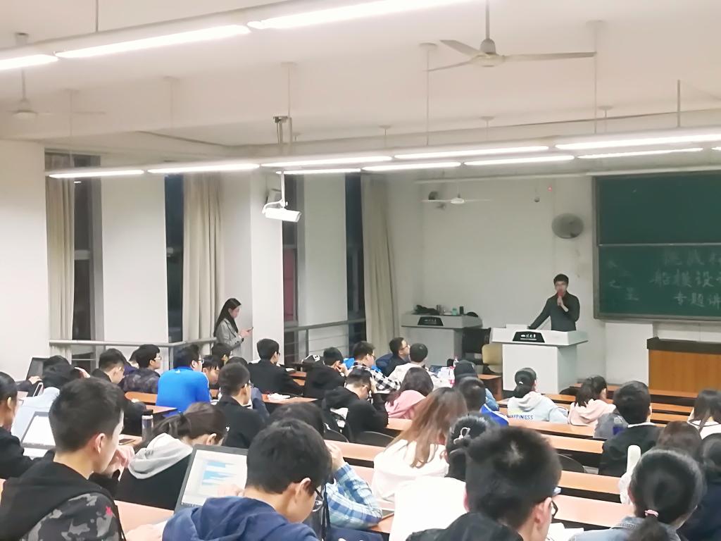 19:10分,宣讲会正式开始。主持人在众人的期盼中将宣讲会的目的和宗旨娓娓道来。接着由用主席团PPT生动的展示了“水上之星船模大赛”的发展历程。同时,也以图片的形式向各位与会者展示了学长学姐们的优秀的船模作品。除此之外,便是这个宣讲会的重头戏,主讲人陈雨教授,用他幽默风趣的言语为参赛者们传授了有关船模设计相关的一些经验和技巧,为选手们在船模设计时遇到的问题进行解答。与此同时,参赛选手们也对船模设计及此次宣讲会表现出极大的兴趣。除了认真听陈雨教授的讲座外,同学们也在下面积极的交流,各自的心得体会,场面十分积极热闹。通过这次宣讲会,参赛者们都从中得到了不少的收获,是他们对船模设计有了跟深一步的了解,对他们的设计有了一定的指导作用。相信听完这次宣讲会后,选手们会设计出更多更好的船模来的。