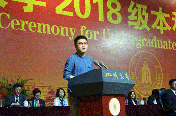 在王仕锐同学演讲过后,在校学生代表、2014级华西公共卫生学院邵俊同学上台表达了对新生的热烈欢迎,并为新生提供了学习和生活上的指导。最后,来自文学与新闻学院的叶小涵同学作为新生代表讲述了自己通过努力学习走出大山的经历,并提醒大家锐意进取,不要虚度光阴,不要浪费掉美好的四年青春。在热烈的掌声中,开学典礼正式结束。