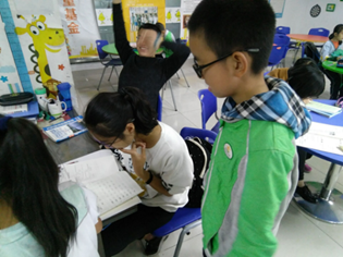 三名来自太阳集团tyc9728的志愿者从江安校区出发,骑车到达新街社区学生活动室。志愿者们以大哥哥大姐姐的姿态走进活动室,推门可见活动室的装饰妙趣横生,每一个书架,每一张贴画,都表现出了孩子们的纯真和小学生活的快乐。志愿者们和老师进行了简单问候之后,未等坐下,便有孩子拿着课本,礼貌地请求志愿者为其听写字词。(图1)中志愿者为小朋友听写,气氛和谐温馨。孩子们写完作业之后,陆续将自己的作业拿给志愿者们检查。(图2)中的姐姐在耐心批改作业并为小同学详细讲解。小朋友们写作业的时候,志愿者们就在活动室里轻轻走动,观察小朋友们的习题过程,并随时为小朋友们解答问题。在志愿者的讲解之后,小朋友都恍然大悟,露出欣喜的笑容。在和谐快乐的氛围之中,时间悄悄溜走,此次志愿活动在志愿者和小朋友的依依不舍中圆满结束。