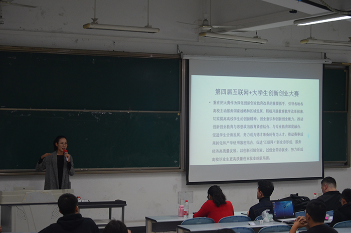 16:50,宣讲会正式开始。首先,姜越同学上台分享了其小组的参赛作品“高空玻璃清洁器”,介绍了作品的研发过程以及其小组的参赛经历。姜越同学的精彩讲解让同学们对“互联网+”大学生创新创业大赛有了初步认识,同时姜越同学讲述的参赛时所遇到的困难引起了同学们的深思。紧接着,吴云皓同学上台为我们分享“互联网+”大学生创新创业大赛的比赛经验。吴云皓同学为我们详细地介绍了“互联网+”大学生创新创业大赛并强调了大赛的性质以及其侧重方向——商业性。吴云皓同学还分享了她所在小组参赛作品以及赛场答辩经验。两位同学绘声绘色的介绍引来了同学们的阵阵掌声。在提问环节,两位同学对即将参赛的同学们所提出的问题作出了简明扼要的回答,为同学们解答了他们的有关比赛的一些疑惑。18:00,本次“互联网+”大学生创新创业大赛宣讲会圆满结束!