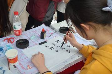 到了下午时分,逐渐升高的气温依旧没有阻挡住同学们来参加活动的热情。同学们认真写毛笔字的画面,也在青春广场上形成了一道亮丽的风景线。看着同学们脸上灿烂的笑容,劳累了一天的干事们也意识到了此次活动的努力没有白费。