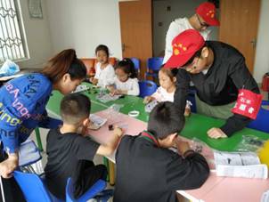 在志愿者与小朋友的欢声笑语之中,两小时匆匆逝去,活动也到了尾声。活动结束时小朋友们和志愿者们一同合影留念,把快乐记录下来。无论是独自做手工,还是与志愿者们一起手工,或是小朋友们的集体手工,其中都不会缺少角色的交流,在过程中孩子会自然设想角色的关系,丰富人际交往经历。手工小礼物的互赠,更直接的增加了彼此之间的感情和联系。志愿者们也积累了经验,提升了自己。希望这些志愿活动的开展可以丰富小朋友的生活,提升他们的能力。