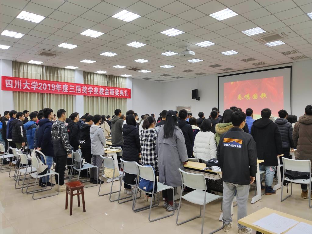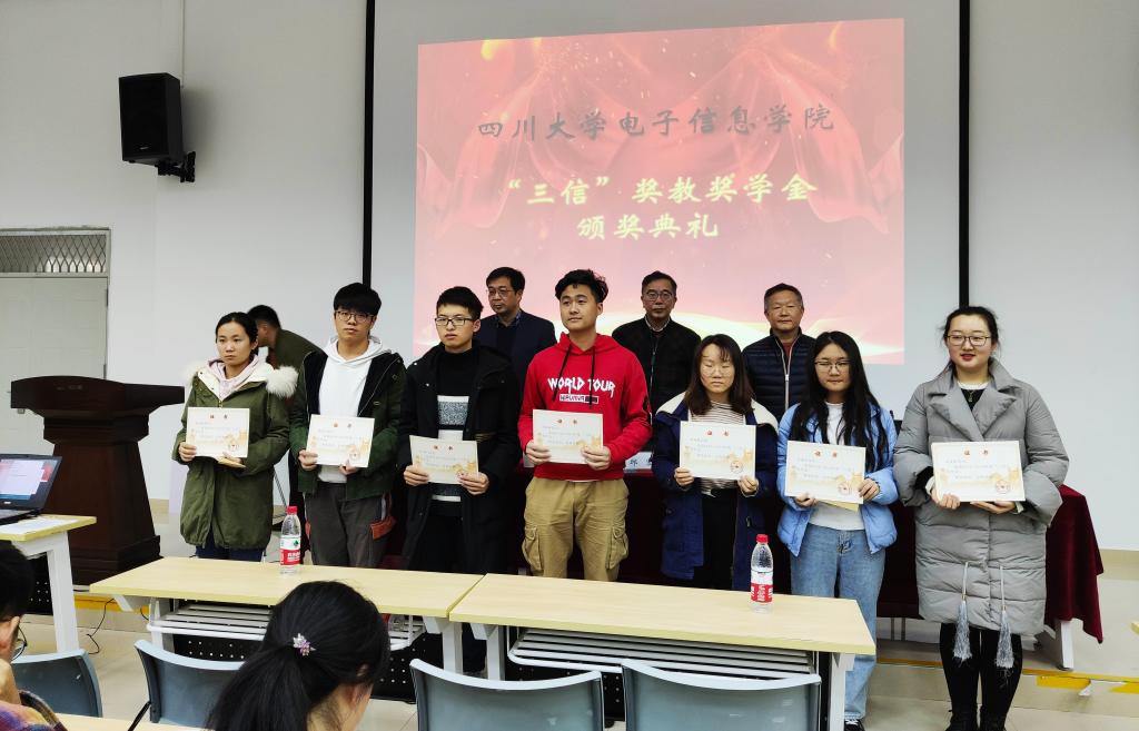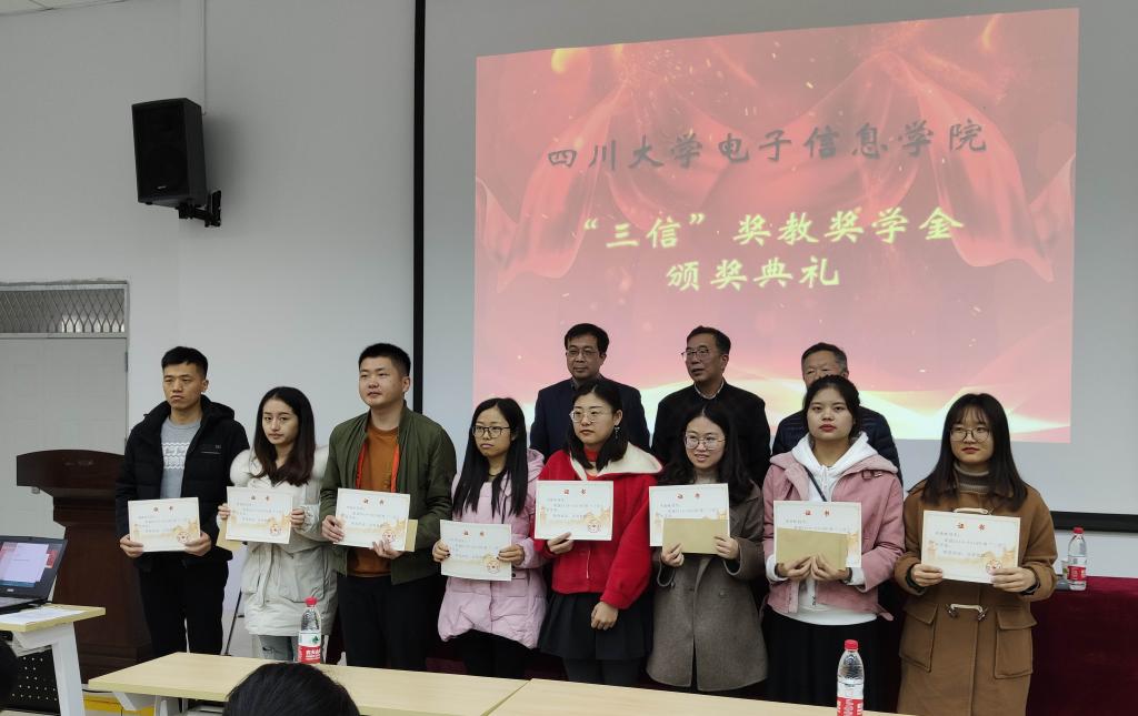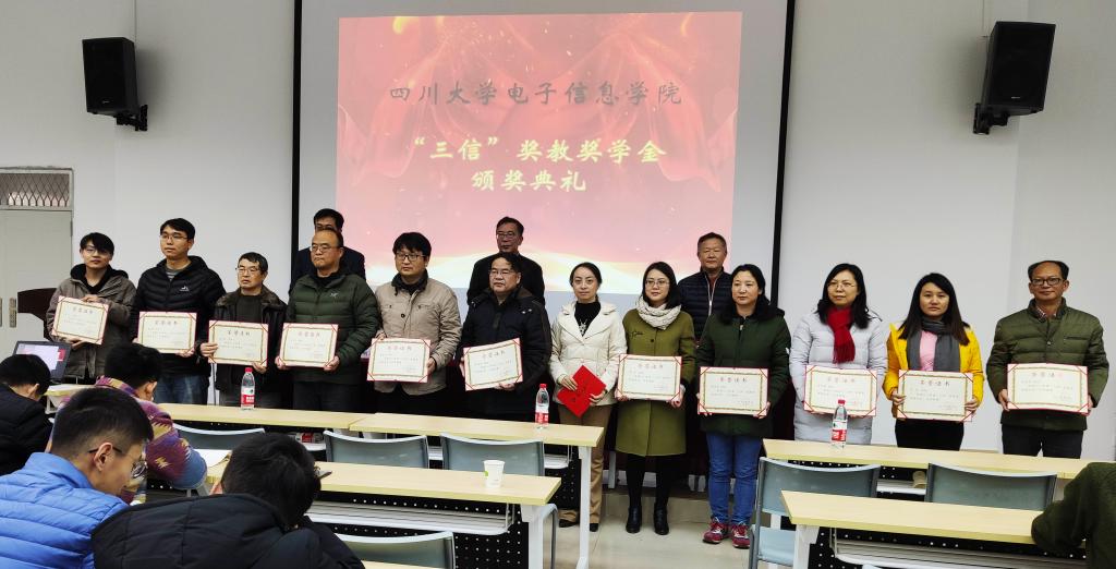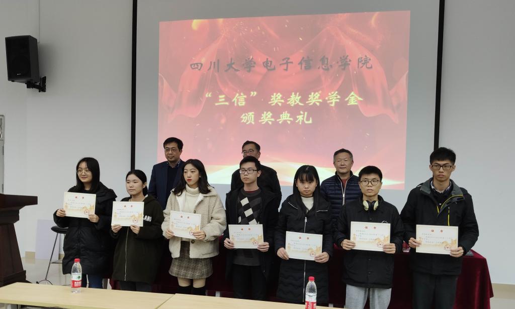 2019年12月13日,太阳集团tyc97282019年度“三信”奖学奖教金的颁奖典礼在望江校区西区附五教101成功举行。本次典礼有幸邀请到了重庆三信电子有限公司董事长邱宏先生、副总经理吴峻先生,ok138cn太阳集团,太阳集团tyc9728,44118太阳成城集团党委邰明松书记参加并主持典礼,参加本次典礼的还有太阳集团tyc9728所有获奖教师、获奖学生,以及学生代表。