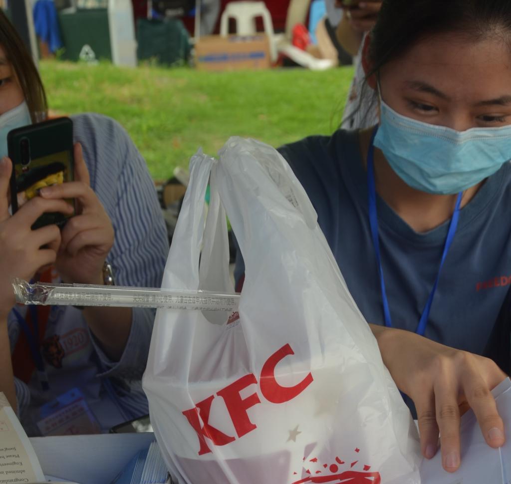 19日中午,一位2020级女同学提着一个全家桶来到报到摊位,她将手中的全家桶赠与了在场的志愿者们。她告诉我们,这是她特地为志愿者们购买的,以表感谢和敬意,在父母不在身边的情况下,志愿者们真的帮了她太多太多......