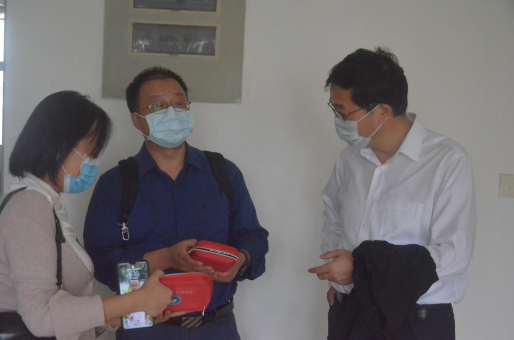 领导们在检查新生配发的防疫包
