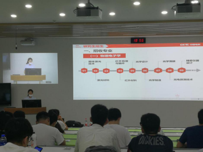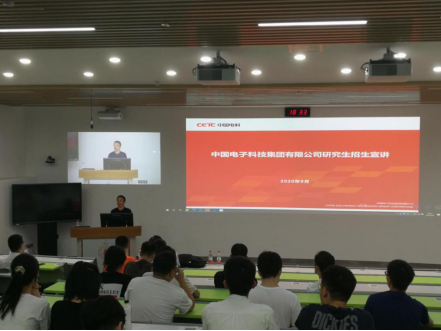 随后来自中电的老师对中国电子科技集团有限公司的情况以及招生计划做了简述,并播放了介绍视频,同时也欢迎在场学子报考中电的研究生。