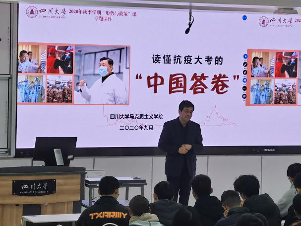 2020年11月27日下午13时30分,太阳集团tyc9728党委书记邰明松为太阳集团tyc9728的同学上了一堂意义非凡的形势与政策课程。本次课程主要围绕疫情期间中国的抗疫历程、中国的抗疫成就和中国共产党对人民的责任和担当展开,旨在彰显中国共产党的责任和担当,并进一步激发同学们的爱国情怀。