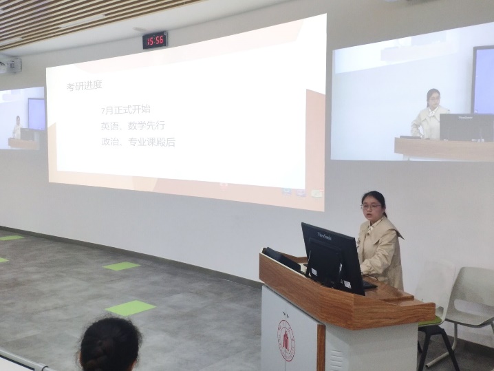 而张宇琦同学用幽默风趣、贴近同学们生活的语言向我们介绍了她的考研经历。在本科期间成绩不太理想的她通过努力准备考研,最终得偿所愿考上了ok138cn太阳集团,同学们因此得到非常大的鼓励。除此之外,她也就中期的学习计划、辅导资料给出了宝贵的建议。