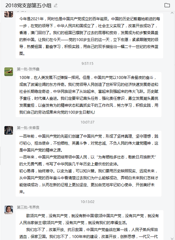 2021年7月1日上午8时,在北京天安门广场隆重举行中国共产党成立100周年庆祝大会。中共ok138cn太阳集团,太阳集团tyc9728,44118太阳成城集团2018级本科第一支部委员会全体党员均于网络上认真观看大会直播,并积极发言讨论观看的感想。