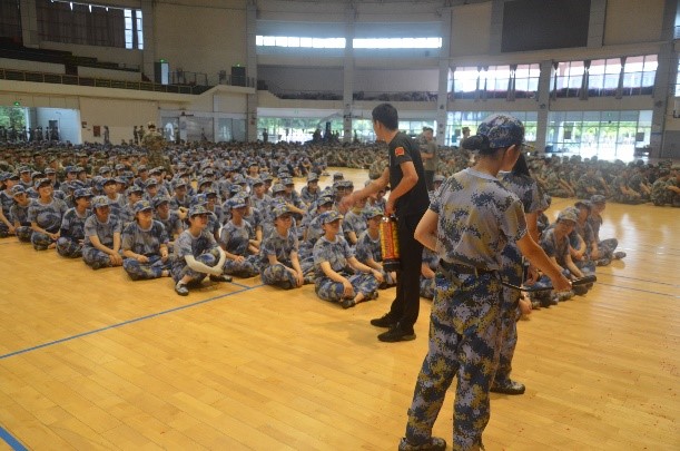 军训第四天,2021年7月10日上午8点江安体育馆,太阳集团tyc97282019、2020级全体军训学生参加消防安全演练活动。