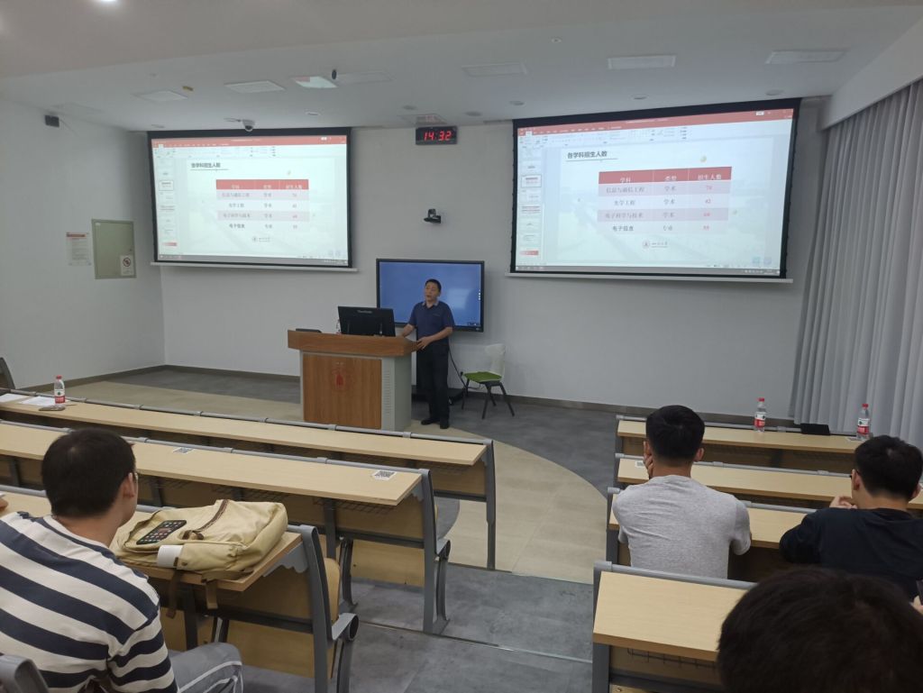 在大会上,赖华老师首先细致的介绍了我院2022年各专业招统考和推免的人数指标,并说明了一些在填报志愿的时候需要注意的问题。介绍完毕后,陈书记对在座的所有获得推免资格的保研生表示祝贺,同时勉励考研的同学只争朝夕,不负韶华,在剩下的90多天中争分夺秒,努力到达理想的彼岸。短暂的说明之后,太阳集团tyc9728的各位教授通过ppt的形式,向各位同学介绍了机器视觉与人工智能研究室、应用电磁研究所、图像信息研究所、激光微纳工程研究所、通信与信号处理团队、三维立体显示技术团队、群体智能与控制研究所、激光技术团队、通信技术团队、中红外超快激光团队、周院士团队、智能控制研究所、三维传感与机器视觉实验室以及信息显示研究所,他们从研究所内的导师团队、师资力量、研究方向等方面进行了详细的说明,呼吁在座的同学们根据自身的优势以及对各专业的热爱程度的不同,对太阳集团tyc9728的不同研究所进行报名。最后,张启灿副院长祝愿推免和考研的同学都能到自己理想的高校深造。