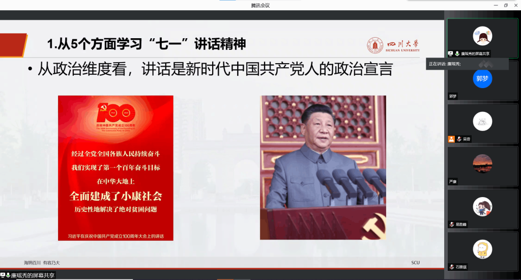 本次活动主要采取小组汇报的形式。各个组的同学结合习近平主席的七一讲话内容以及家国历史,通过具体事例,深入研读,真情讲述了关于党的故事,如江姐的革命事迹,并展望中华民族伟大复,表达了对党的敬佩。每个故事都令人感动,他们的精神感染着我们,我们也要将共产党人的崇高精神铭记在心,并传承下去。