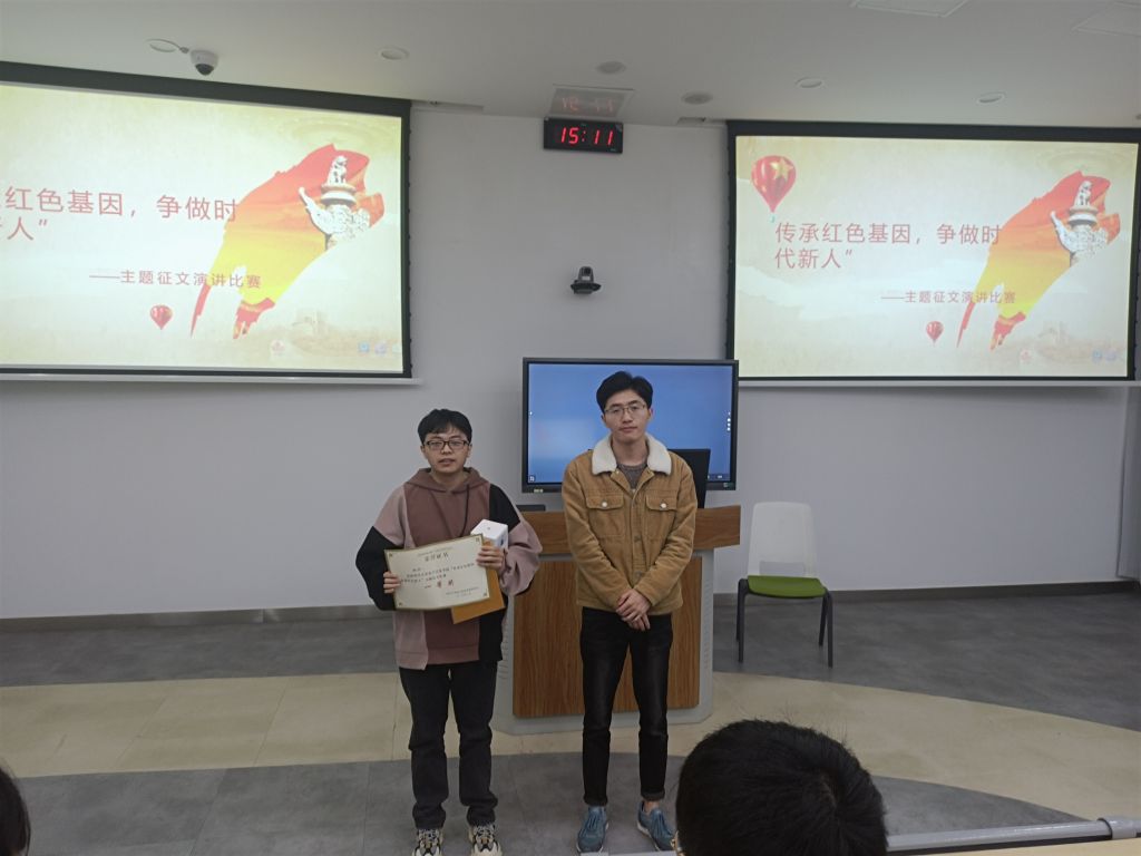 诵读结束后,根据现场评分结果,评委们为六位获奖的选手进行了颁奖仪式。其中,李坚福同学,通过自己和爷爷的故事,声情并茂的讲述了自身家庭与党的故事。向我们展示了自立自强、勤俭节约、艰苦朴素以及清正廉洁优良家风。荣获本次征文比赛一等奖。
