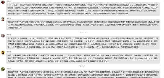 观看完毕后,同学们在QQ群发表了观看感想,纷纷表示:全会通过的决议全面总结了党百年奋斗的历史经验,使我们新时代中国共产党人看清楚过去为什么能够成功、弄明白未来怎样才能继续成功。伟大成就鼓舞人心,宝贵经验弥足珍贵,历史使命催人奋进。作为中华民族伟大复兴的见证者、推动者和实践者,我们必将肩负起“强国一代”的历史责任,时刻保持有舍我其谁的使命感和时不我待的紧迫感,奋力实现中华民族伟大复兴的中国梦。