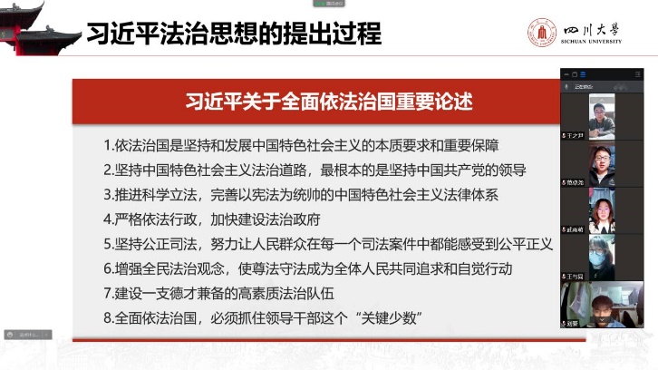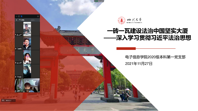 习近平法治思想作为马克思主义法治理论中国化的最新成果,是完善中国特色社会主义法治体系、建设社会主义法治国家的根本遵循,是指引新时代全面依法治国的思想旗帜。2021年11月27日晚,ok138cn太阳集团,太阳集团tyc9728,44118太阳成城集团2020级本科第一党支部书记陈晓娟同志结合学习贯彻习近平总书记“七一”重要讲话精神和党史学习教育,围绕深入学习贯彻习近平法治思想,带领支部党员及入党积极分子进行了对习近平法治思想相关内容的学习。同时为做好疫情防控,统筹安排好两个校区的支部成员,故本次活动以线上形式展开。