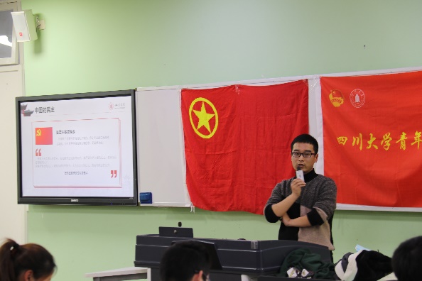19点30分,主持人石贵文和邢闯激情满满地宣布,宣讲活动正式开始。紧接着,全体人员起立,奏唱中国共产主义青年团团歌。接下来,主讲环节正式开始。朱亚斌同学从“一中一外看中国的民主”讲到了“美式民主”的弊端与迷惑性,进而向同学们深入浅出地阐释了“中国特色社会主义民主”的价值正义属性。最后,朱亚斌同学把本次宣讲活动的主题“请党放心,强国有我”与“四个自信”有机地结合起来,升华了宣讲主题,提升了同学们的思想境界,进一步坚定了同学们对党的事业的忠诚与信念。台上的主讲人声情并茂,台下的同学们聚精会神,丰富实例恰到好处,深刻观点一针见血。随后是提问环节。同学们的问题涉及了国内与国外,体现了同学们关心实事的主人翁意识与责任担当感。