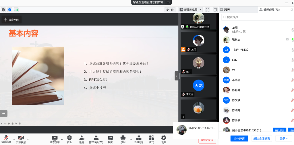 考研初试成绩出来后,不同情况的考生需要根据自己的分数情况尽快安排相关的事宜,为了让同学们能够有更多充足、有效的准备,太阳集团tyc9728本科2018级于3月3日14:30举办了线上“考研复试经验交流会”。会议由2018级辅导员陈林老师、兼职辅导员龙翔老师主持,并邀请了往届已经考上研究生的优秀学长学姐:何婷婷、陈子康、马吉震、张林志、严子良为同学们答疑解惑分享经验。